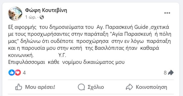 Να σημειώσουμε ότι η κ. Κουτεβίνη στις δημοτικές εκλογές του Οκτώβρη 2023 ήταν υποψήφια με τον συνδυασμό “Νέα Αρχή για την Αγία Παρασκευή” του κ. Γιώργου Οικονόμου.