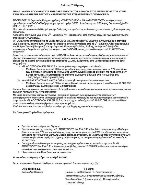 Στις 23 Μαΐου 2012 το Δημοτικό μας Συμβούλιο –κατά πλειοψηφία- «εγκρίνει την δωρεάν παραχώρηση της χρήσης χώρου του 2ου Γυμνασίου Αγίας Παρασκευής προς τον ΠΑΟΔΑΠ για τη λειτουργία του Δημοτικού Θερινού Κινηματογράφου ‘’ΣΙΝΕ ΣΧΟΛΕΙΟ-ΘΑΝΑΣΗΣ ΒΕΓΓΟΣ’’ για το χρονικό διάστημα από 21 Ιουνίου έως 2 Σεπτεμβρίου 2012» (αρ.απ.146/2012- αναρτ. 6/6/2012).