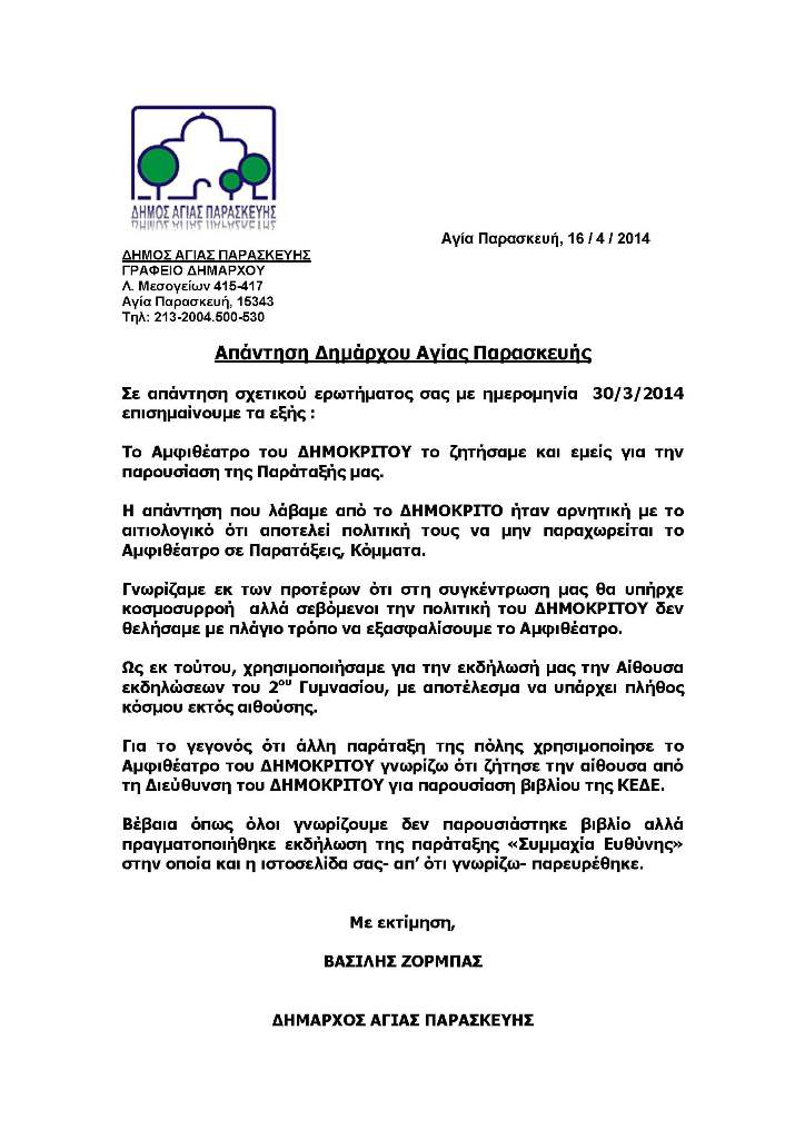 2) Η απάντηση του Δημάρχου Αγίας Παρασκευής κ. Βασίλη Ζορμπά (κλικ για μεγέθυνση στην εικόνα)
