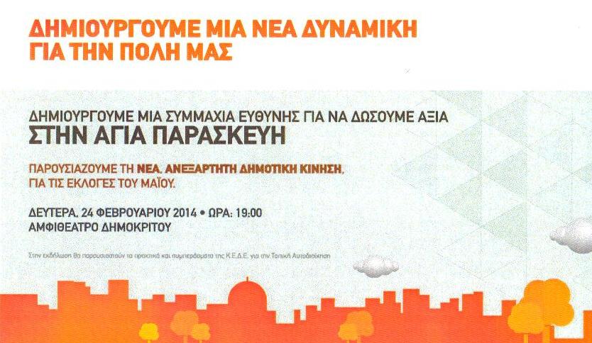 Θα θυμάστε εκείνη την πανηγυρική παρουσίαση της παράταξης «ΣΥΜΜΑΧΙΑ ΕΥΘΥΝΗΣ» στο αμφιθέατρο του «Δημοκρίτου» στις 24 Φεβρουαρίου 2014. Στην πρόσκληση της εκδήλωσης μας κίνησαν την περιέργεια τα ψιλά γράμματα που υπήρχαν στο κάτω μέρος και έγραφαν: «Στην εκδήλωση θα παρουσιαστούν τα πρακτικά και συμπεράσματα της Κ.Ε.Δ.Ε. για την Τοπική Αυτοδιοίκηση». Ουδείς βέβαια από τους παραβρισκόμενους ανέφερε ή άκουσε κάτι σχετικό. Όμως γιατί υπήρχε αυτή η φράση στην πρόσκληση που κοινοποιήθηκε;