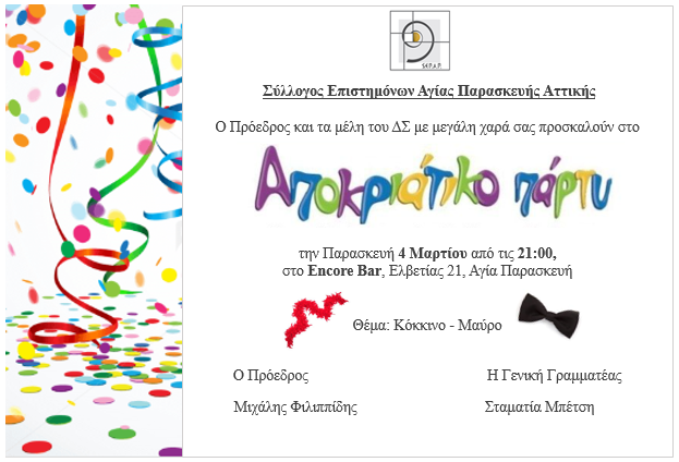 Αρχική ΕΚΔΗΛΩΣΕΙΣ Αποκριάτικο Πάρτυ απο τον Σύλλογο Επιστημόνων Αγίας Παρασκευής