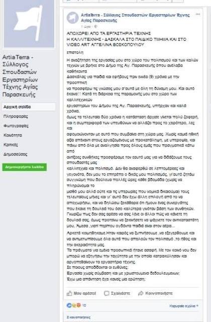 Η ακόλουθη επιστολή αναρτήθηκε σήμερα περίπου στις 5 μ.μ. στην διαδικτυακή σελίδα του Συλλόγου Σπουδαστών Εργαστηρίων Τέχνης, Artia Terra, στο Facebook. Σύμφωνα με τα αναγραφόμενα η καθηγήτρια κ. Αγγελίνα Βοσκοπούλου αποχωρεί αφήνοντας αιχμές για τον τρόπο λειτουργίας των Εργαστηρίων Τέχνης. Μάλιστα στην επιστολή αναφέρει πως “Αρκετά κοιμηθηκαμε.Ηταν καιρός να ξυπνήσουμε ,να εξεγερθουμε και να αντιμετωπίσουμε όλα αυτά που απειλούν τον πολιτισμό ,το ήθος και την ακεραιότητα μας.” και κλείνει με τη φράση: “Εργασία χωρίς σύμβαση και με χρωστουμενα δεδουλευμενων;”.