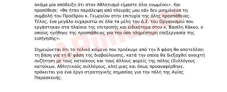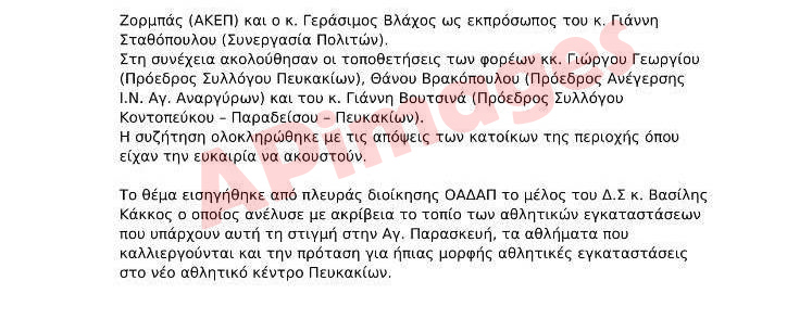 Η ουσία είναι, όπως ειπώθηκε στη συνάντηση ότι «το αθλητικό κέντρο έχει προέρθει από την εισφορά σε γη των οικοπέδων των κατοίκων, άρα δεν μπορεί τα δικά τους οικόπεδα να τα χαρίσει, ούτε να τα πάρει ο οποιοσδήποτε»