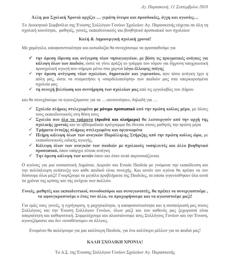 ΣΥΛΛΟΓΟΙ-ΦΟΡΕΙΣΣΥΛΛΟΓΟΙ Ενωση Γονέων Αγίας Παρασκευής: Ευχές σε όλη τη Σχολική Κοινότητα για μια Καλή & Δημιουργική Σχολική Χρονιά! 11/09/2018 Facebook Twitter Google+ Print .