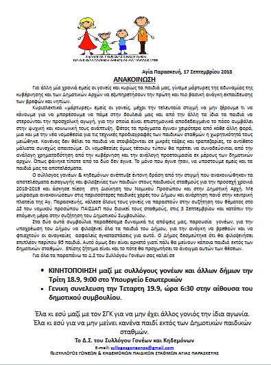 ΣΥΛΛΟΓΟΙ-ΦΟΡΕΙΣΣΥΛΛΟΓΟΙ Ο Σύλλογος Γονέων & Κηδεμόνων Παιδικών Σταθμών δεν μπορεί να είναι «ΕΠΑΙΤΗΣ» για το αυτονόητο 17/09/2018 Facebook Twitter Google+ Print