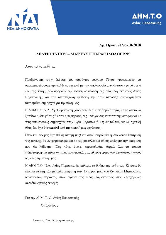 Το κομμάτι αυτό της δήλωσης του κ. Αυγενάκη έρχεται να ανατρέψει με ανακοίνωσή της η Τοπική Οργάνωση της Ν.Δ. Αγίας Παρασκευής, την οποία υπογράφει ο πρόεδρος κ. Γιάννης Καραγιαννάκης και στην οποία αναφέρει πως «Η ΔΗΜ.Τ.Ο. ΝΔ Αγίας Παρασκευής ουδέποτε έλαβε επίσημο αίτημα, με το οποίο να ζητείται η άποψή της ή έστω η περιγραφή της υπάρχουσας κατάστασης αναφορικά με τους υποψηφίους Δημάρχους στην Αγία Παρασκευή. Ως εκ τούτου, καμία σχετική θέση δεν έχει διατυπωθεί από την τοπική μας οργάνωση…».