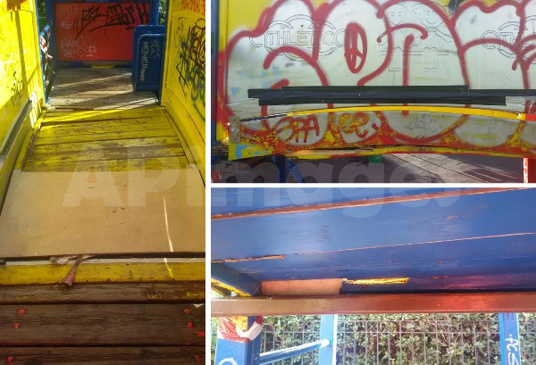 Οι εικόνες δείχνουν πεντακάθαρα επικίνδυνα παιχνίδια, με σπασμένα ξύλα, με τρύπες, διαβρωμένα από την υγρασία και σκουριασμένα σίδερα. Τις φωτογραφίες δημοσίευσαν και κοινοποίησαν γονείς στο Facebook, αγανακτισμένοι από την κατάσταση και φοβούμενοι για την υγεία των παιδιών τους. Μάλιστα παραλίγο να υπάρξει και σοβαρό ατύχημα, αλλά ευτυχώς το πρόλαβαν οι ίδιοι, όπως αναφέρει δημόσια μια μητέρα: