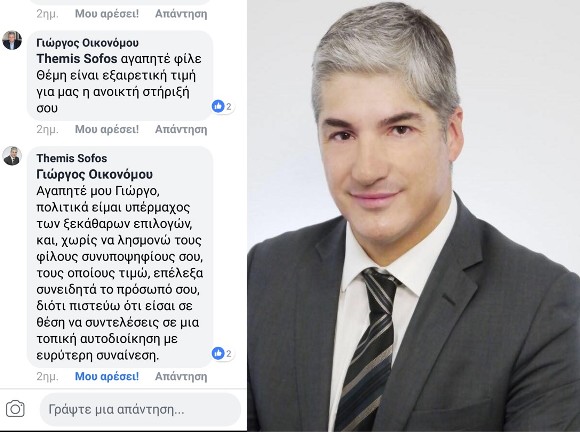Αισθάνομαι την ανάγκη να ευχαριστήσω τον συμπολίτη μας Θέμη Σοφό, εξέχοντα νομικό και αντιπρόεδρο του Δικηγορικού Συλλόγου Αθηνών, για τη δημόσια στήριξή του στο πρόσωπό μου στις επερχόμενες αυτοδιοικητικές εκλογές.