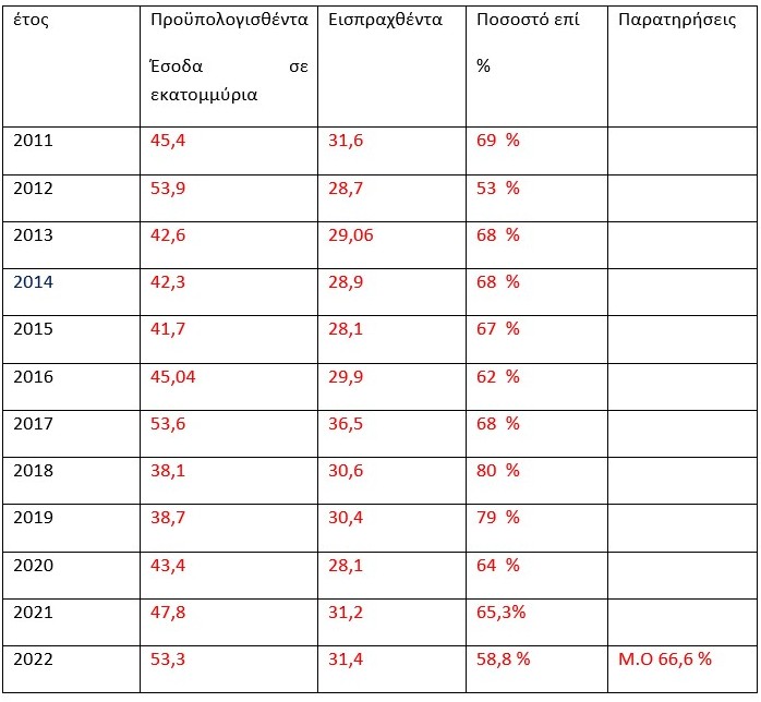 Η υλοποίηση των Π/Υ από το 2011 μέχρι και το 2022 υλοποιούνται κατά ΜΟ 66.6 % όπως φαίνεται στον παρακάτω πίνακα.