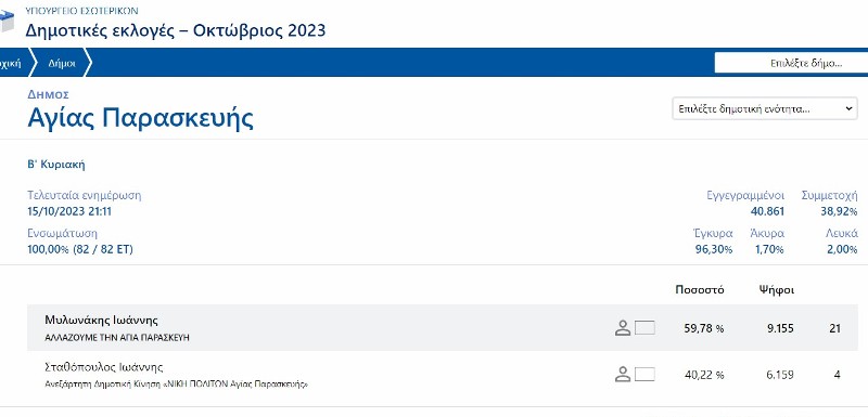Δήμαρχος Αγίας Παρασκευής εκλέγεται ο κ. Μυλωνάκης με διαφορά 2.996 ψήφων. Ο οποίος λαμβάνει 21 έδρες έναντι 4 του κ. Σταθόπουλου.