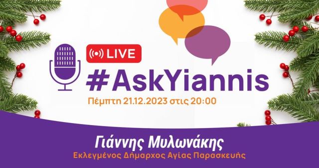 Λίγες μόνο ημέρες πριν αναλάβει τα καθήκοντά του, ο Εκλεγμένος Δήμαρχος Αγίας Παρασκευής Γιάννης Μυλωνάκης απαντάει και πάλι ζωντανά στις δικές σας ερωτήσεις!