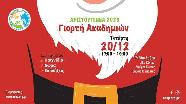 Το Διοικητικό Συμβούλιο και οι προπονητές του Αθλητικού Σωματείου Αγίας Παρασκευής σας προσκαλούν στη Χριστουγεννιάτικη Γιορτή των Ακαδημιών 2023.
