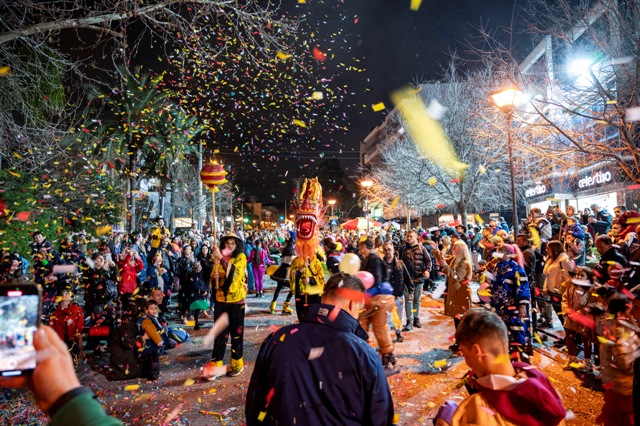 Η βραδιά ξεκίνησε με μουσικές από dj και τη σχολική μπάντα «Underground Frequencies» και συνεχίστηκε με την Κόκκινη Αποκριάτικη Παρέλαση όπου οι 14 τυμπανιστές «BLOCO SWINGUEIRA» έδωσαν το σύνθημα της έναρξης ξεσηκώνοντας τον κόσμο, ενώ πίσω τους ακολουθούσαν ο Κινέζικος Δράκος, χορευτικό γκρουπ, μασκότ, εμψυχωτές με πατίνια και φυσικά οι χιλιάδες Καρναβαλιστές της πόλης.