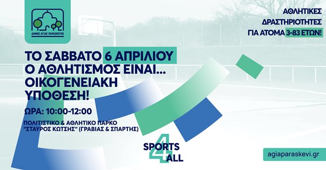 Στο πλαίσιο της Παγκόσμιας Ημέρας Αθλητισμού για την Ανάπτυξη και την Ειρήνη, ο Δήμος Αγίας Παρασκευής το Σάββατο 6 Απριλίου, διοργανώνει από τις 10 το πρωί έως και τις 12 μ.μ., αθλητική εκδήλωση στην οποία μπορούν να συμμετάσχουν πολίτες όλων των ηλικιών.