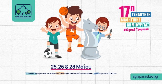 Στο πλαίσιο της 17ης Συνάντησης Μαθητικής Δημιουργίας η οποία σε ότι αφορά το πολιτιστικό της μέρος ολοκληρώθηκε με πολύ μεγάλη επιτυχία, ο Δήμος Αγίας Παρασκευής διοργανώνει το Σάββατο 25, την Κυριακή 26 και την Τρίτη 28 Μαΐου, αθλητικό τουρνουά Μπάσκετ, Ποδοσφαίρου και Σκάκι, στο οποίο θα συμμετάσχουν μαθητές δημοτικών σχολείων και Γυμνασίων της Αγίας Παρασκευής.