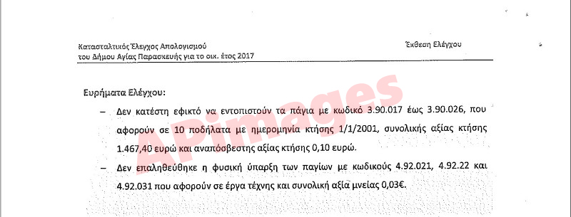 Ενδεικτικά, για να καταλάβουμε την κατάσταση που επικρατούσε τα προηγούμενα έτη στη Διαχείριση του Δήμου Αγίας Παρασκευής, αναφέρουμε συνοπτικά ορισμένα σημαντικά σημεία της Έκθεσης Ελέγχου που αφορούν την περιουσία και τα πάγια: