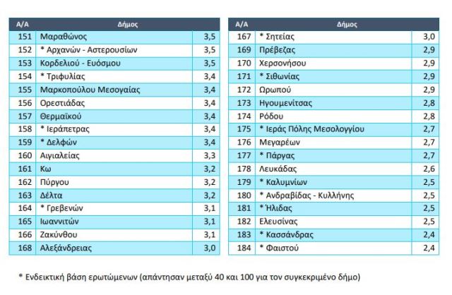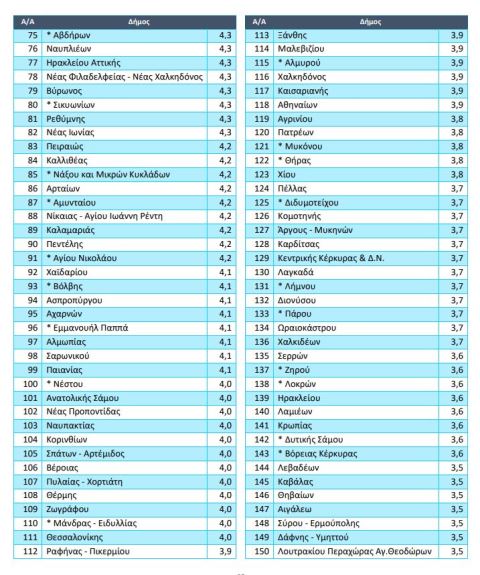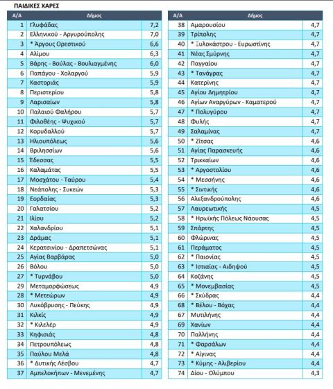 Τους δήμους με τις καλύτερες, ασφαλέστερες και περισσότερες παιδικές αλλά και εκείνους που μάλλον δεν εξασφαλίσουν ιδανικούς χώρους παιχνιδιού για τα μικρά παιδιά ψήφισαν οι 64.789 πολίτες μέσω του axiologisi.ypes.gov.gr. Συγκεκριμένα, από τους 184 για τους οποίους υπήρχε ικανό δείγμα στις πέντε πρώτες θέσεις βρίσκονται οι δήμοι Γλυφάδας (7,2), Ελληνικού – Αργυρούπολης (7,0), Αργους Ορεστικού (6,6), ΑΛίμου (6,3), Βάρης – Βούλας – Βουλιαγμένης (6,0) αντίθετα στις πέντε τελευταίες θέσεις βρέθηκαν οι δήμοι Ανδραβίδας – Κυλλήνης, Ηλιδας, Ελευσίνας (2,5), Κασσάνδρας και Φαιστού (2,4) .