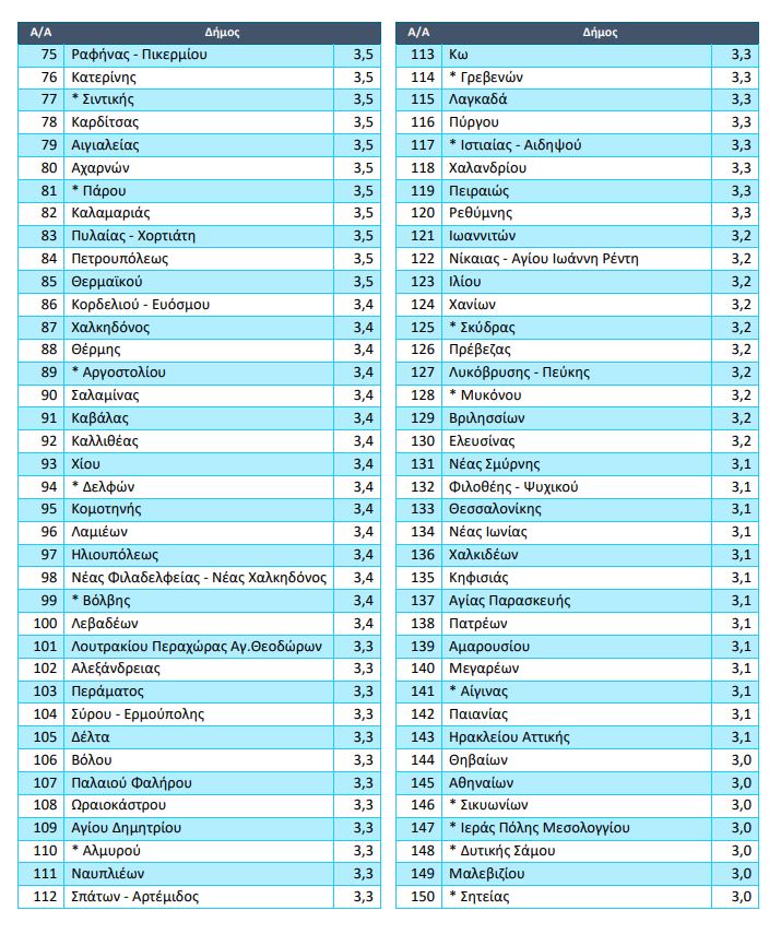 Με βάση αυτά, από τους 184 για τους οποίους υπήρχε ικανό δείγμα στις 4 “πρώτες” θέσεις (με κάτω από τη βάση) ισοβαθμούν οι δήμοι Κιλελέρ, Έδεσσας, Καστοριάς, Εορδαίας (4,9 στα 10) και ακολουθούν οι Δήμοι Άργους-Ορεστικού, Νάξου (4,8), Φλώρινας (4,7) και Κιλκίς (4,6). Στις τελευταίες θέσεις: Ρόδος, Σιθωνία, ηΚασσάνδρα και Πάργα.