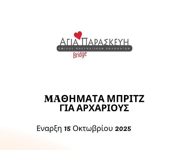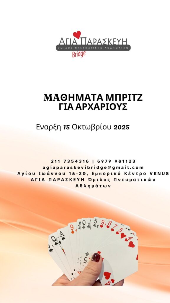 Mαθήματα “Μπριτζ” για αρχάριους Αγίου Ιωάννου 18-20 Αγία Παρασκευή έναρξη 15/10