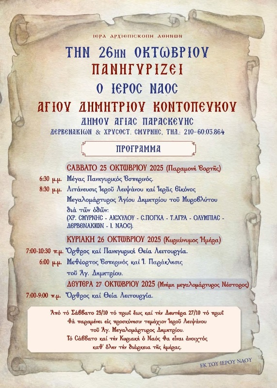 Πρόγραμμα του Ι.Ν Αγίου Δημήτριου Κοντοπεύκου στις 26/10