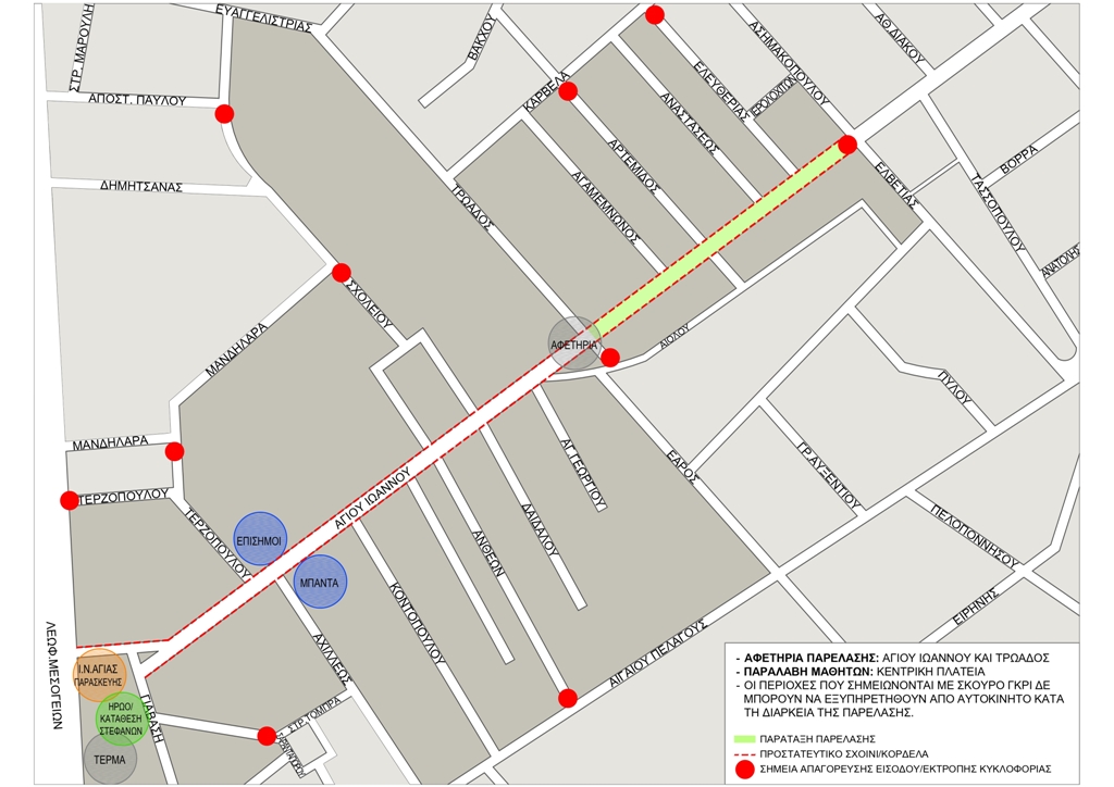 Λάβετε υπόψη σας, ότι οι περιοχές που σημειώνονται με σκούρο γκρι χρώμα στο χάρτη, δε θα μπορούν να εξυπηρετηθούν από αυτοκίνητο κατά τη διάρκεια της παρέλασης.