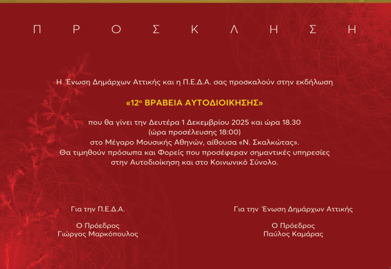 12α Βραβεία Αυτοδιοίκησης τις Ένωσης Δημάρχων Αττικής στις 1/12 στο Μέγαρο Μουσικής