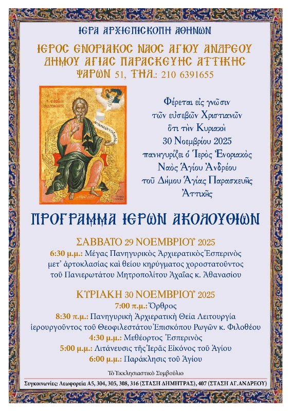 Πρόγραμμα πανηγύρεως Ι.Ν Αγίου Ανδρέου δήμου Αγίας Παρασκευής 29&30/11