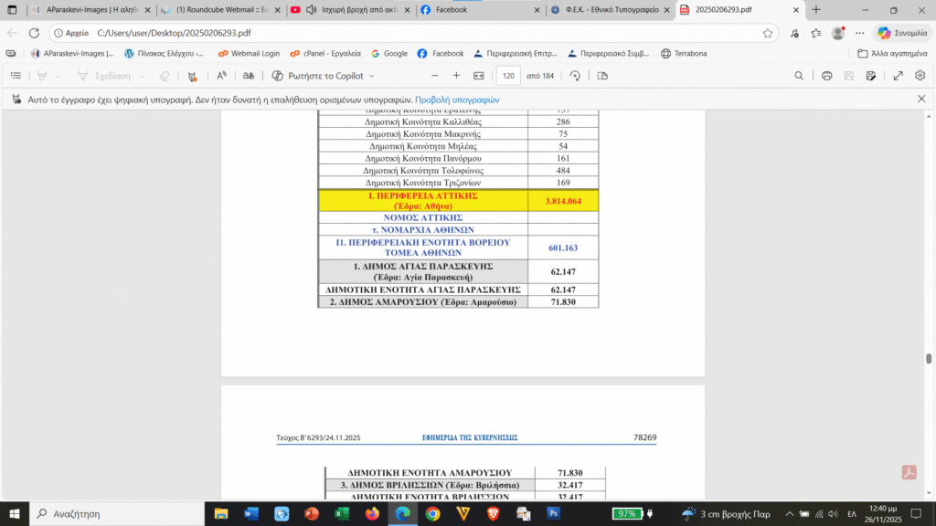 Το Υπουργείο Εσωτερικών δημοσίευσε σε ΦΕΚ αναλυτικά όλους τους Πρωτοβάθμιους (Δήμους) και Δευτεροβάθμιους (Περιφέρειες) Οργανισμούς Τοπικής Αυτοδιοίκησης της Χώρας. Η καταγραφή γίνεται με την πρόταξη της Περιφέρειας, ακολουθούν οι Νομοί, ως γεωγραφικός προσδιορισμός, οιΠεριφερειακές Ενότητες, κατ’ αλφαβητική σειρά, και τέλος, αναγράφονται οι Δήμοι, οι Δημοτικές Ενότητες και οι Δημοτικές Κοινότητες. Στην Περιφέρεια Αττικήςη καταγραφή γίνεται με πρόταξη της Περιφέρειας και ακολουθούν ο Νομός και η τ. Νομαρχία Αθηνών, η τ. Νομαρχία Πειραιώς, η τ. Νομαρχία Ανατολικής Αττικής και η τ. Νομαρχία Δυτικής Αττικής, ως γεωγραφικός προσδιορισμός, οι Περιφερειακές Ενότητες, κατ’ αλφαβητική σειρά, που εντάσσονται χωρικά στις τ. Νομαρχίες και τέλος, αναγράφονται οι Δήμοι, οι Δημοτικές Ενότητες και οι Δημοτικές Κοινότητες. Ο πληθυσμός των Περιφερειών, Περιφερειακών Ενοτήτων, Δήμων, Δημοτικών Ενοτήτων και Δημοτικών Κοινοτήτων προκύπτει από την