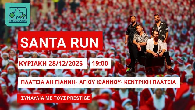 Ο Δήμος Αγίας Παρασκευής προσκαλεί μικρούς και μεγάλους στο πιο χαρούμενο και γιορτινό γεγονός της χρονιάς, το Santa Run, που θα πραγματοποιηθεί την Κυριακή 28 Δεκεμβρίου στις 19:00, και θα ολοκληρωθεί με μια μοναδική συναυλία από το συγκρότημα Prestige.