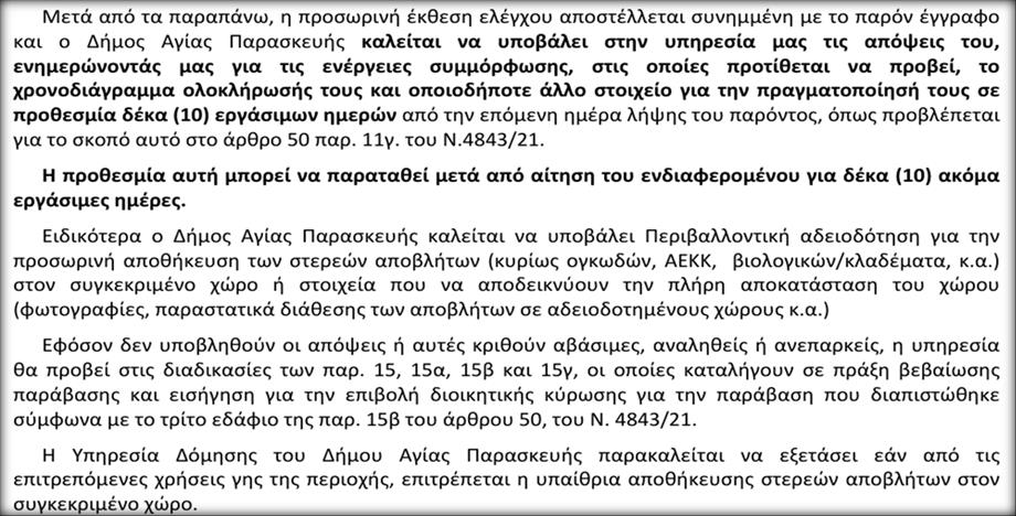 Στην παρακάτω προσωρινή έκθεση ελέγχου της Διεύθυνσης Περιβάλλοντος της Περιφέρειας Αττικής η Δημοτική Αρχή Μυλωνάκη καλείται σε απολογία εντός 10 εργάσιμων με δυνατότητα παράτασης για ακόμα 10 εργάσιμες με την προθεσμία να λήγει ΣΗΜΕΡΑ 9/1/2026. Συμπτωματικά (;) την επόμενη μέρα απ’ την οποία η Δημοτική Αρχή ξεκίνησε να ρίχνει μπετά…