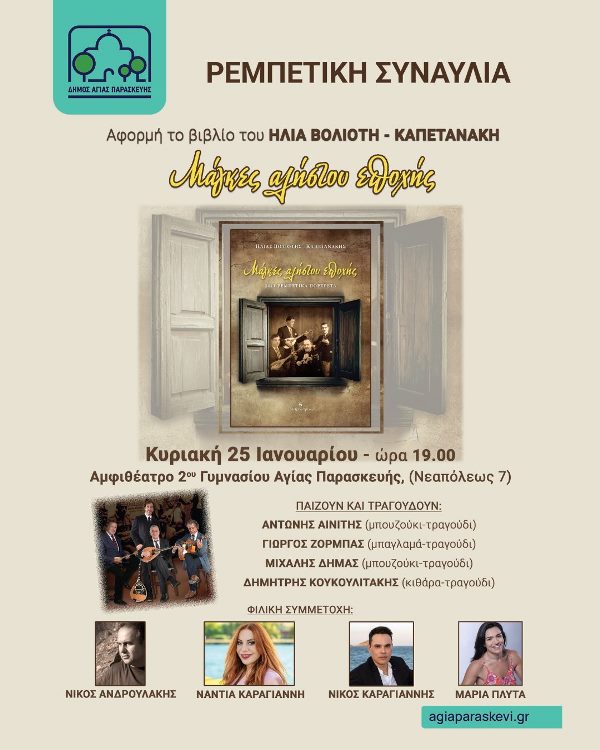 Ο Δήμος Αγίας Παρασκευής σας προσκαλεί σε μια ξεχωριστή ρεμπέτικη βραδιά, με αφορμή το βιβλίο του Ηλία Βόλιωτη – Καπετανάκη «Μάγκες αλήστου εποχής».