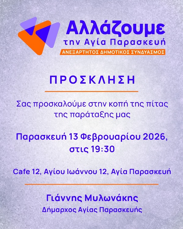 Φίλες και φίλοι, σας περιμένουμε στην κοπή της πίτας μας, για να συναντηθούμε, να ανταλλάξουμε ευχές και να ξεκινήσουμε τη νέα χρονιά όλοι μαζί.
