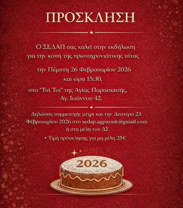 Παρακαλούμε όπως μας δηλώσετε την συμμετοχή σας και τον αριθμό των ατόμων, το αργότερο μέχρι τις 23 Φεβρουαρίου 2026 εδώ
