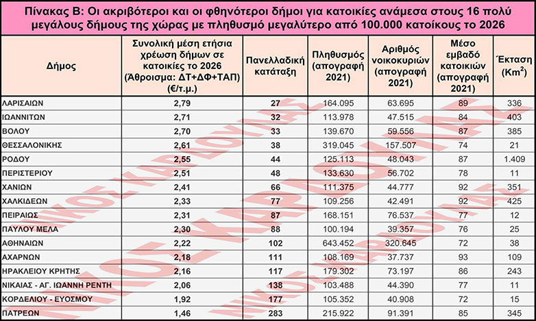 Στον πίνακα Β που ακολουθεί απεικονίζονται η συνολική μέση ετήσια χρέωση σε κατοικίες των 16 πολύ μεγάλων Δήμων της χώρας, με πληθυσμό μεγαλύτερο από 100.000 κατοίκους το 2026, η πανελλαδική τους κατάταξη και ο πληθυσμός, ο αριθμός νοικοκυριών, το μέσο εμβαδό κατοικιών και η έκτασή τους (ΕΛΣΤΑΤ).