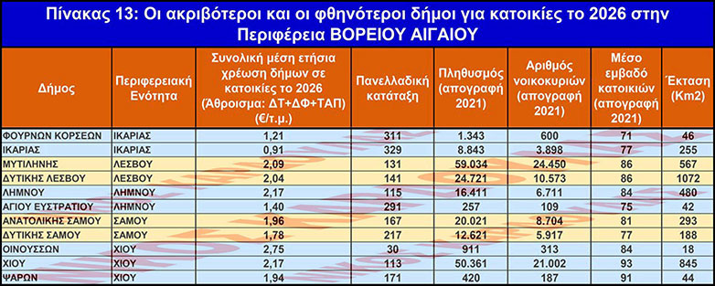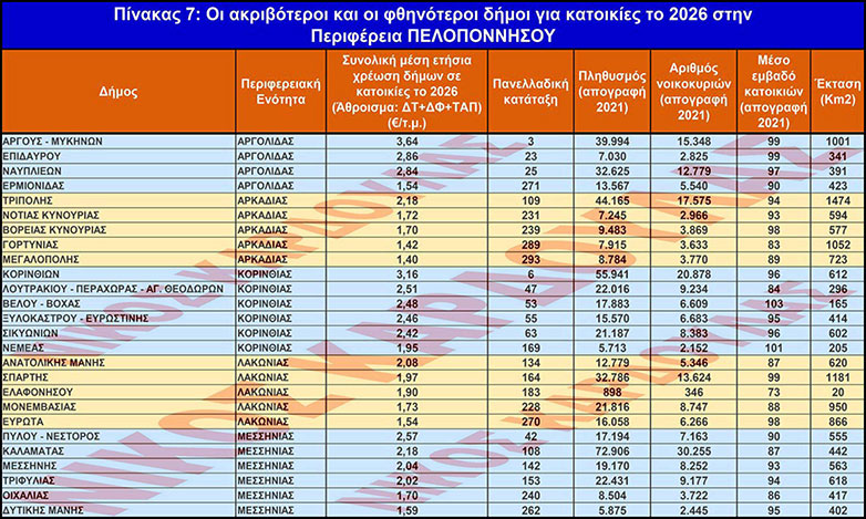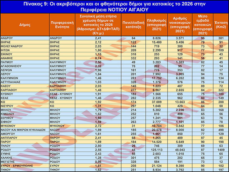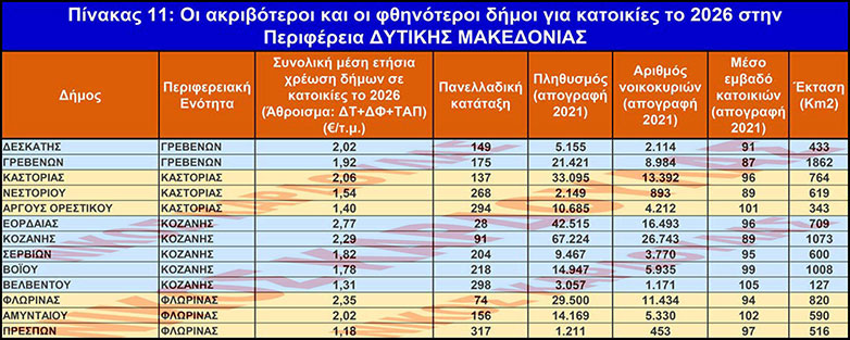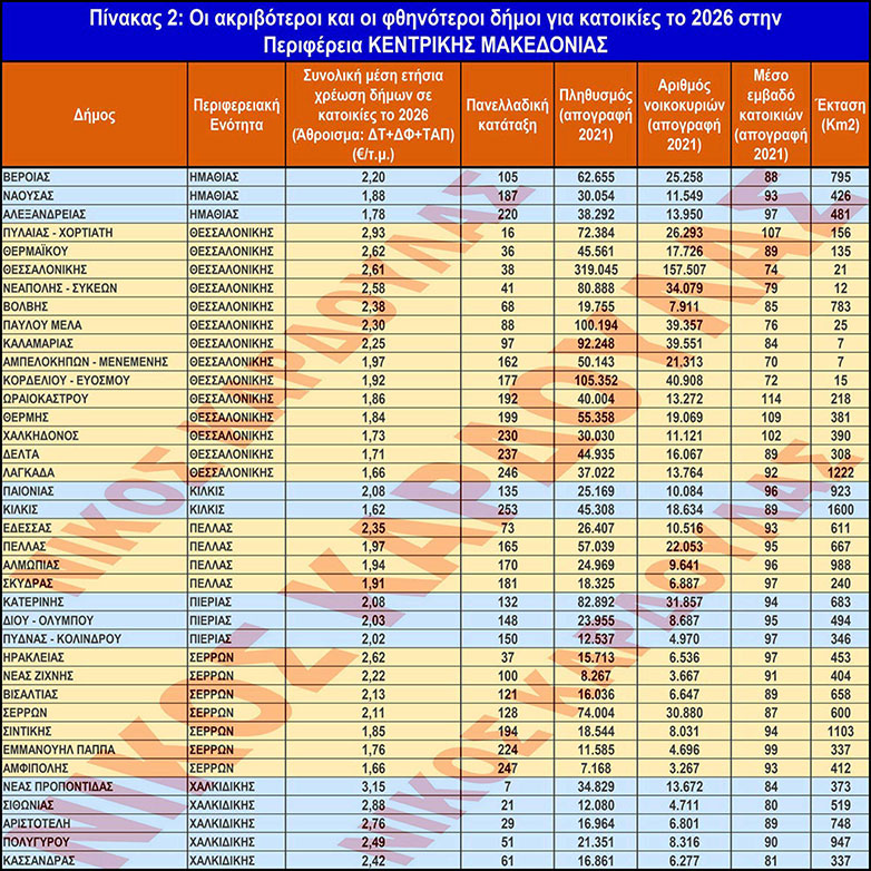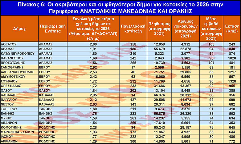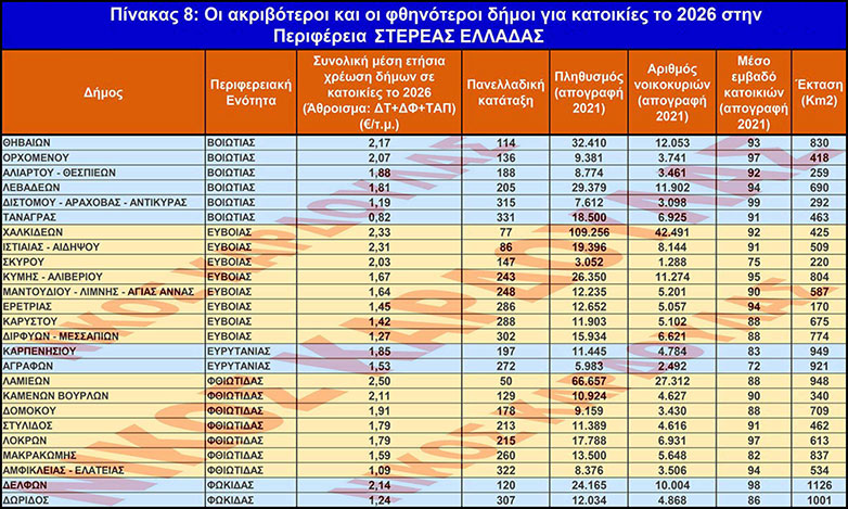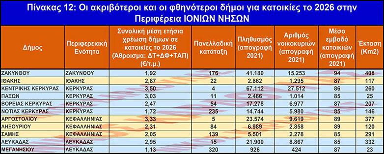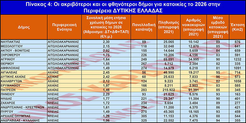 Ο ακριβότερος Δήμος για κατοικίες στην Ελλάδα το 2026, είναι ο Δ. Ύδρας με συνολική χρέωση ανά τ.μ. 3,69 €, και ακολουθούν οι Δήμοι Χαλανδρίου (3,67 €), Άργους-Μυκηνών (3,64 €), Κεντρικής Κέρκυρας (3,50 €) και Αργοστολίου (3,33 €), ενώ ο φθηνότερος Δήμος είναι ο Δ. Ανάφης (0,74 €) και ακολουθούν οι Δήμοι Τανάγρας (0,82 €), Αργιθέας (0,87 €), Ικαρίας (0,91 €) και Μεγίστης (0,96 €).