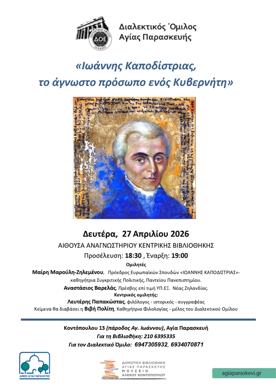 Ο Δήμος Αγίας Παρασκευής σε συνεργασία με το Διαλεκτικό Όμιλο Αγίας Παρασκευής πραγματοποιούν στις 27 Απριλίου 2026, ημέρα Δευτέρα και ώρα 19:00, στο Αναγνωστήριο της Δημοτικής Βιβλιοθήκης Αγίας Παρασκευής-Μουσείο Αλέκου Κοντόπουλου εκδήλωση με θέμα: «Ιωάννης Καποδίστριας, το άγνωστο πρόσωπο ενός Κυβερνήτη», με κεντρικό ομιλητή τον Λευτέρη Παπακώστα, φιλόλογο, ιστορικό, συγγραφέα και με εισηγητές: τη Μαίρη Μαρούλη-Ζηλεμένου, Πρόεδρο Ευρωπαϊκών Σπουδών «ΙΩΑΝΝΗΣ ΚΑΠΟΔΙΣΡΙΑΣ», καθηγήτρια Συγκριτικής Πολιτικής, Παντείου Πανεπιστημίου και τον Αναστάσιο Βαρελά, Πρέσβη επί τιμή ΥΠ.ΕΞ. Νέας Ζηλανδίας.