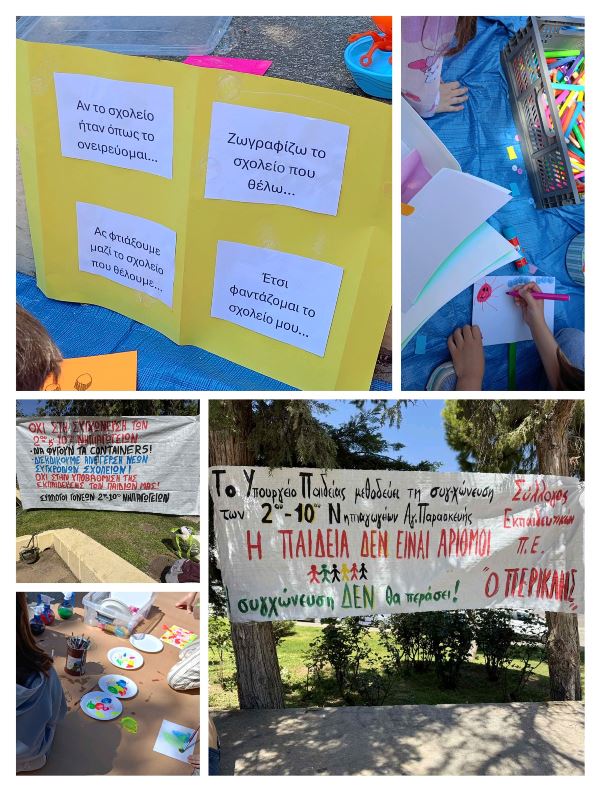Με πινέλα και χρώματα πραγματοποιήθηκε η κινητοποίηση των Συλλόγων Γονέων των 2ου – 10ου Νηπιαγωγείων, της Ένωσης και του Συλλόγου Εκπαιδευτικών Π.Ε. «Ο Περικλής» την Κυριακή 26 Απριλίου το πρωί, στο θεατράκι της πλατείας Αγίας Παρασκευής.