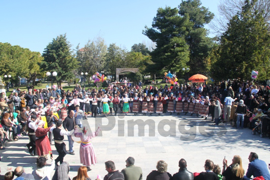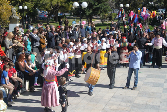 Η παραδοσιακή πομπή ξεκίνησε από το 1ο Δημοτικό και κατέληξε στο θεατράκι της πλατείας γεμίζοντάς το με μουσικές, ήχους κουδουνιών από τις στολές τους, ήχους γκάιντας και χορούς. Και σήμερα το θεατράκι ήταν γεμάτο μικρούς και μεγάλους που πήγαν να διασκεδάσουν και να μπουν στο πνεύμα της αποκριάς με κάτι διαφορετικό.