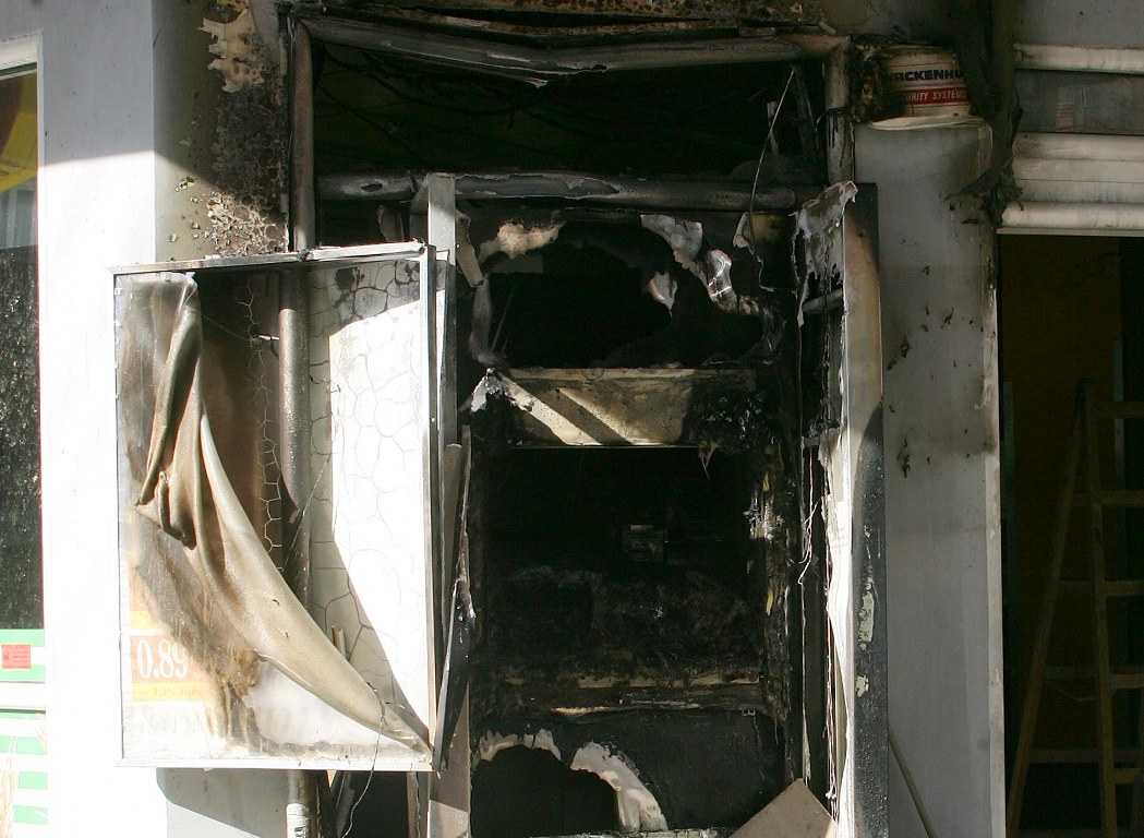 Επίθεση με γκαζάκια πραγματοποίησαν άγνωστοι τη νύχτα σε μηχάνημα αυτόματης ανάληψης (ΑΤΜ) της τράπεζας “Eurobank” στην οδό Ιασωνίδου 25, με αποτέλεσμα να προκληθούν ζημιές στην πρόσοψη υπεραγοράς τροφίμων, όπου είναι εγκατεστημένο. Θεσσαλονίκη, Δευτέρα 27 Φεβρουαρίου 2006. ΑΠΕ/MEGAPRESS/ΠΑΥΛΟΣ ΜΑΚΡΙΔΗΣ